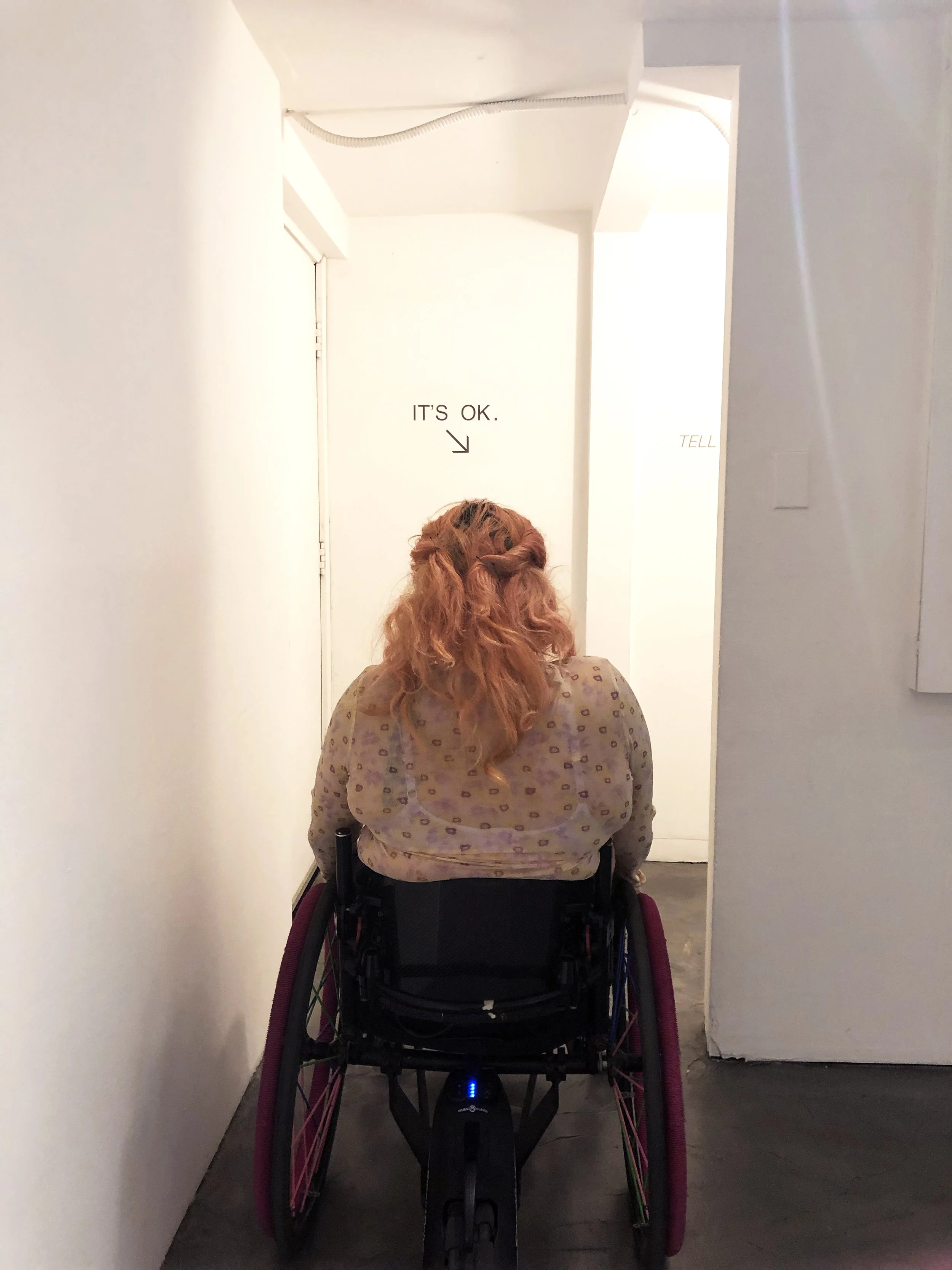 Is a working project that started in 2015 that deals with inaccessible art spaces around Los Angeles. I am a physically disabled person who has been going to visit art shows for over 10 years and during that time I have experienced many instances of Inaccessibility. After many instances of exclusion I could no longer ignore my experience so I decided to make work about my denied access. By going to an opening or closing of a show that I’ve been invited to, saw on social media, or knew was inaccessible from prior experience. Then I would sit outside the gallery/ Artspace/performance space for the entire opening or closing and document my performance with help from friends and strangers using video and photos to tell my story.
